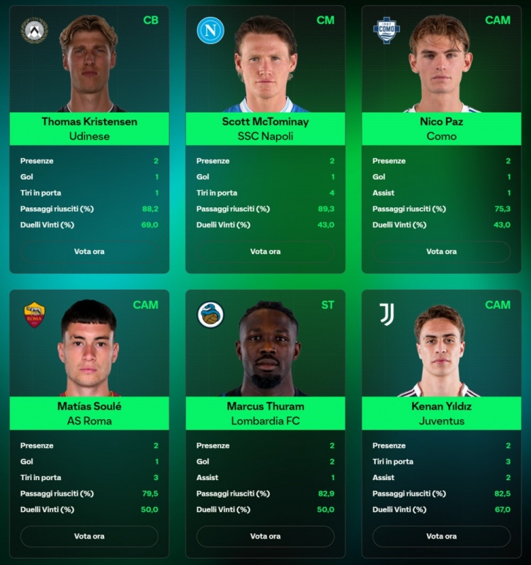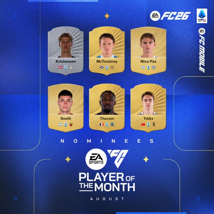 9月4日讯 意甲8月最佳候选公布,麦克托米奈、小图拉姆、伊尔迪兹、帕斯、苏莱、托马斯-克里斯滕森6名球员入围。
