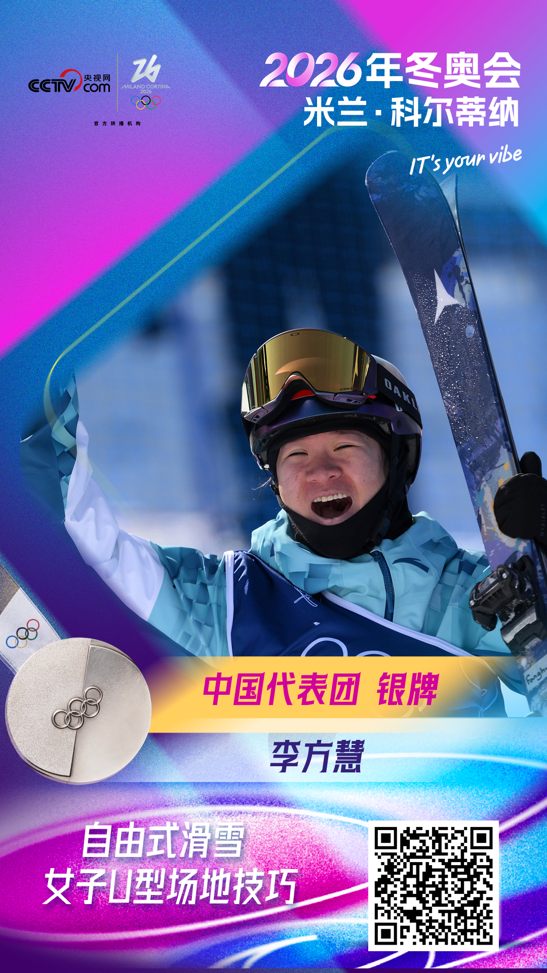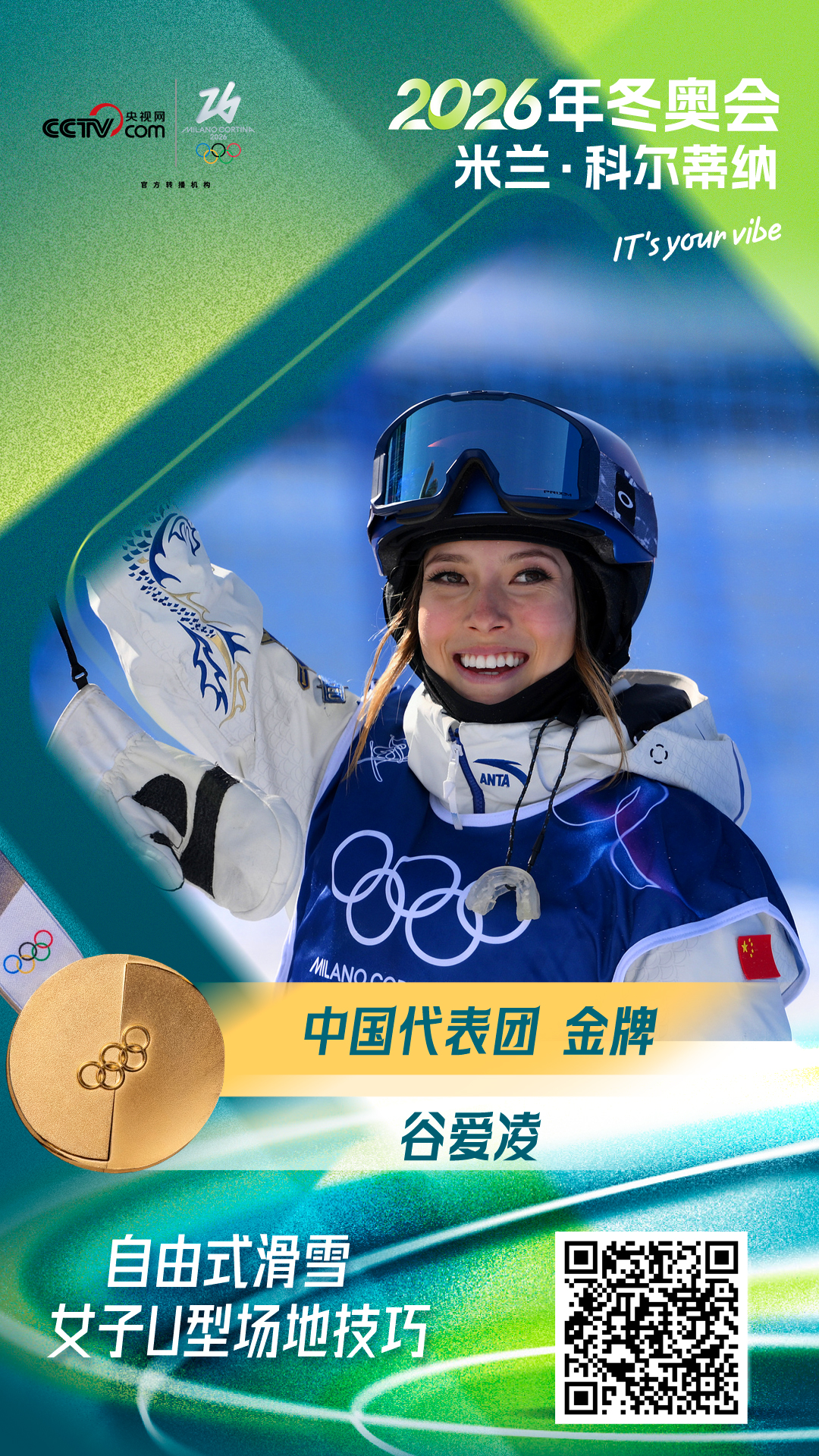 央视网消息:北京时间2月22日,2026年冬奥会自由式滑雪女子U型场地技巧决赛,中国选手谷爱凌凭借第三跳的94.75分,获得冠军。这也是中国代表团在本届冬奥会上的第5金!另一名中国选手李方慧在第三跳中发挥出色,获得93.00分,最终获得亚军,中国队包揽冠亚军。