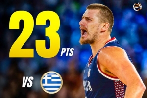 代表塞尔维亚出战的约基奇本场比赛表现炸裂,他全场出战27分钟,两分球12投8中,三分2中0,罚球10中7,独揽23分19篮板4助攻。